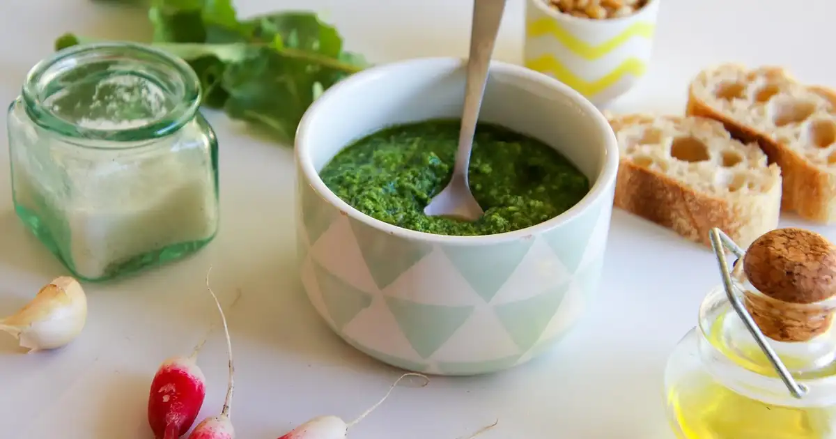 Roquette, fanes de radis, oseille ou ail des ours sont puissants. Sans equilibre, votre pesto peut devenir agressif. Ajoutez alors
